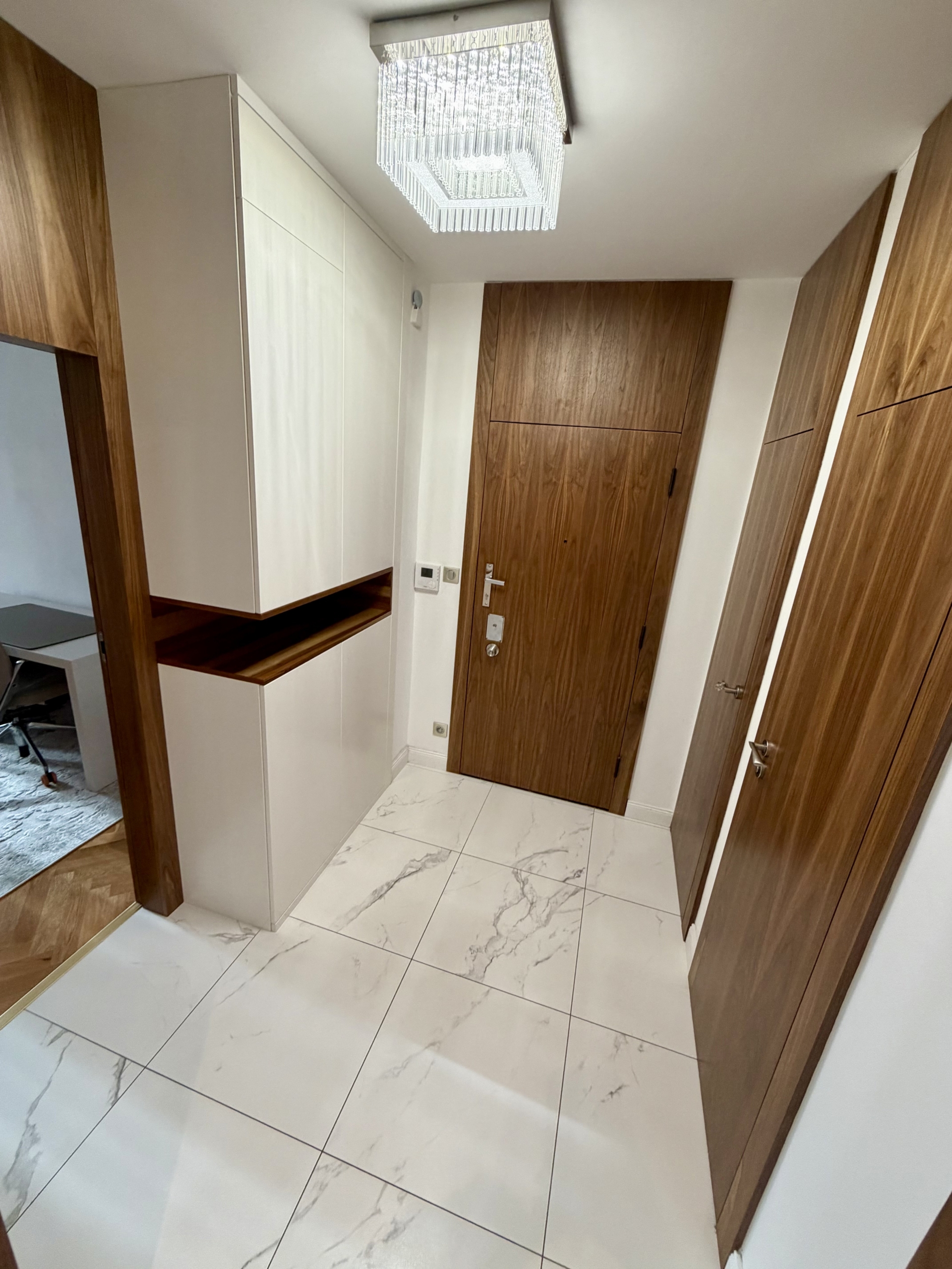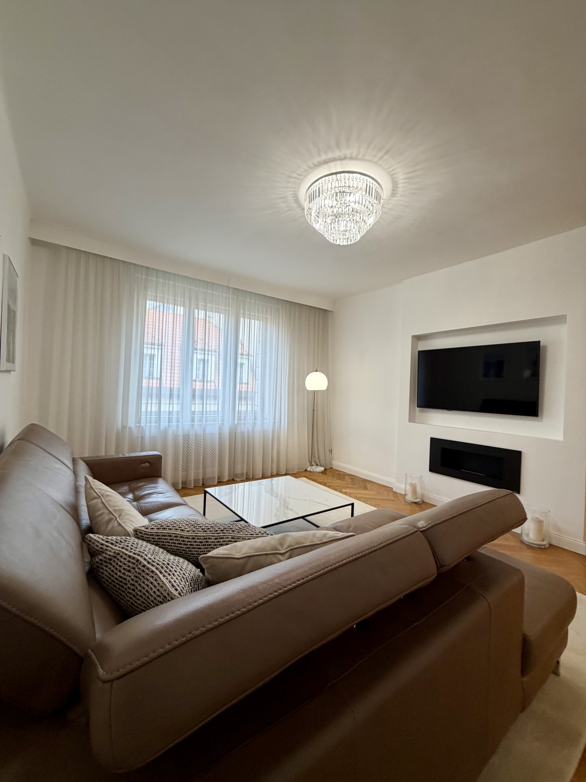 Byt nabízí maximální komfort, vysoký standard vybavení a vkusný, nadčasový design. Prostorný obývací pokoj je vybaven koženou sedací soupravou s elektrickým polohováním, plynovým krbem, televizí a originálním křišťálovým osvětlením, které podtrhuje elegantní atmosféru interiéru.