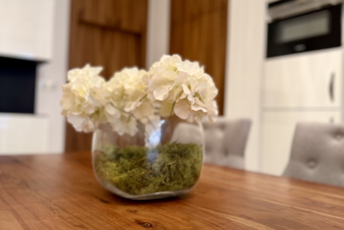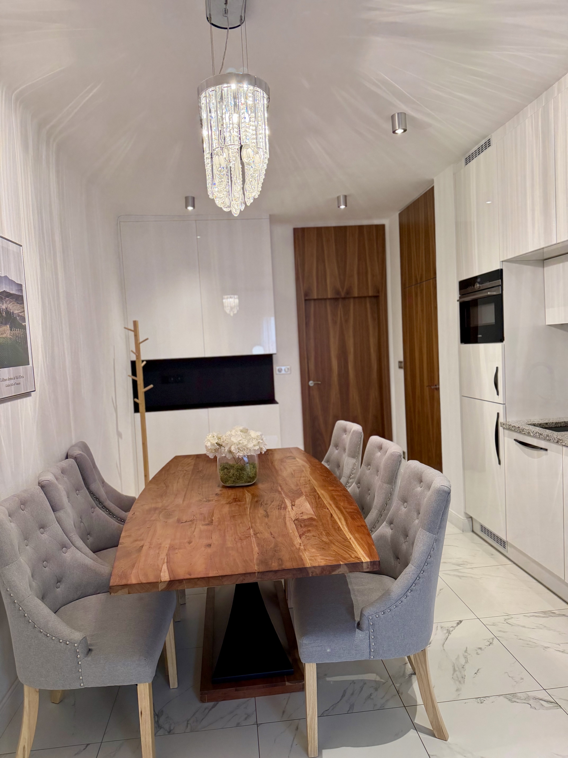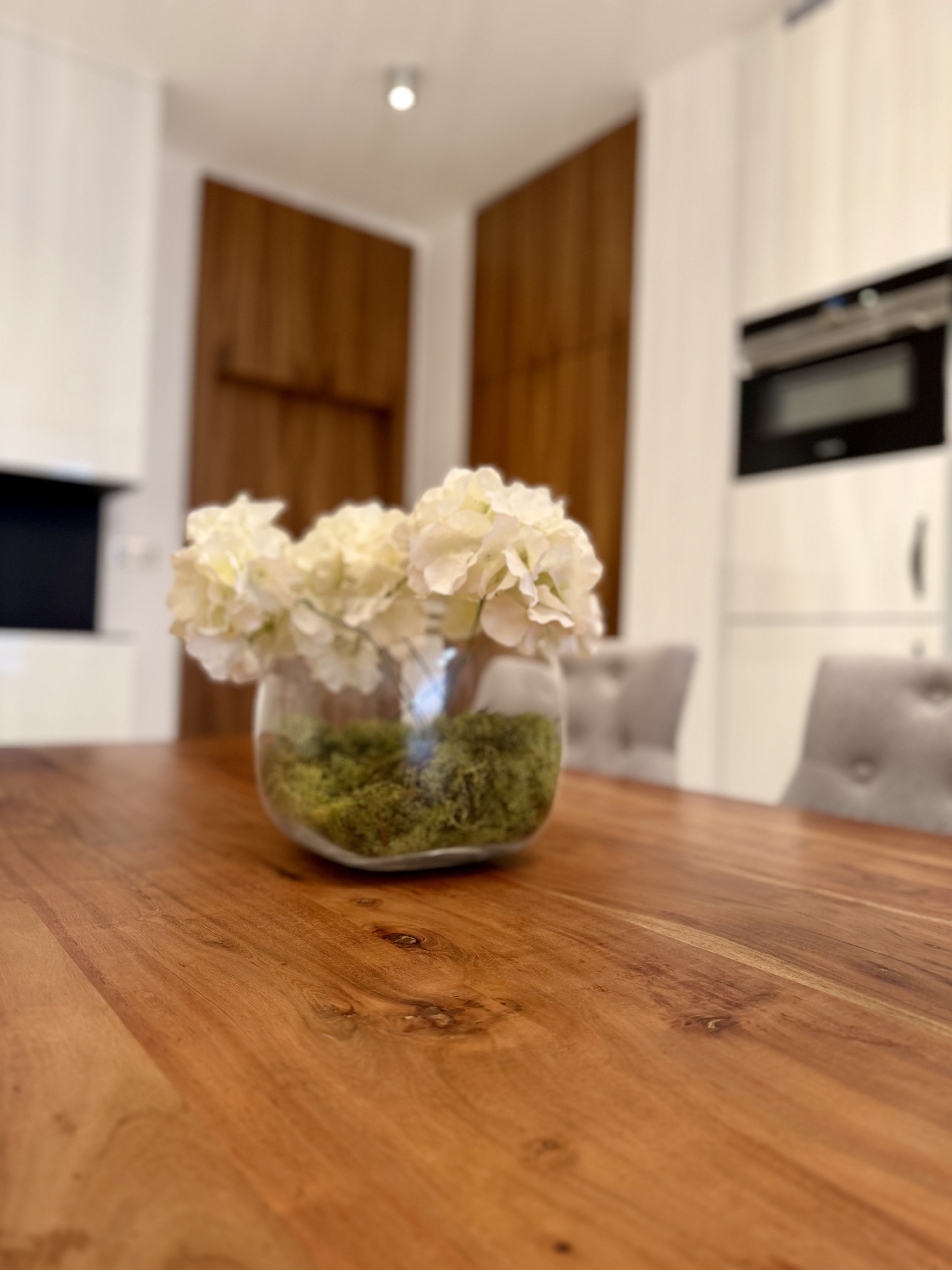 Samostatná kuchyně je plně vybavena včetně základního nádobí značky Villeroy & Boch, indukční varné desky, digestoře, vestavěné lednice a trouby Siemens, vinotéky Electrolux a okamžitého ohřívače vroucí vody. Na kuchyni navazuje jídelna s masivním jídelním stolem z akácie pro 6 osob, čalouněnými křesly, doplněné designovým křišťálovým osvětlením.