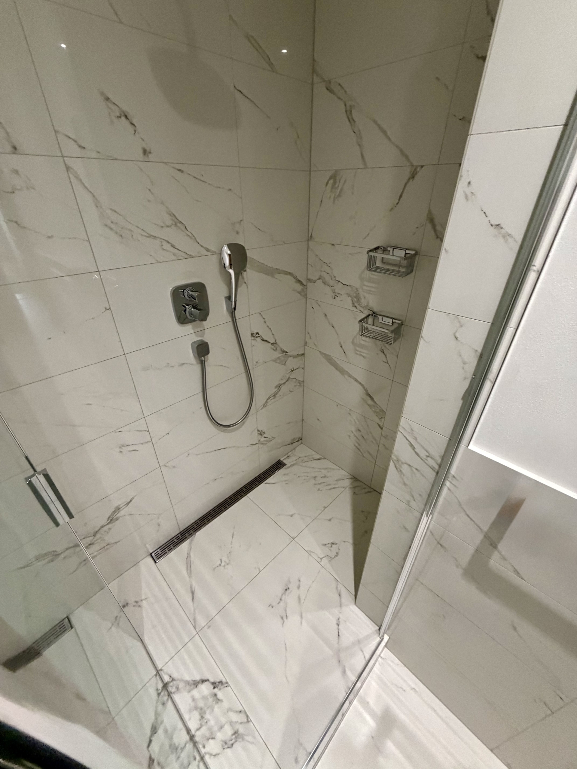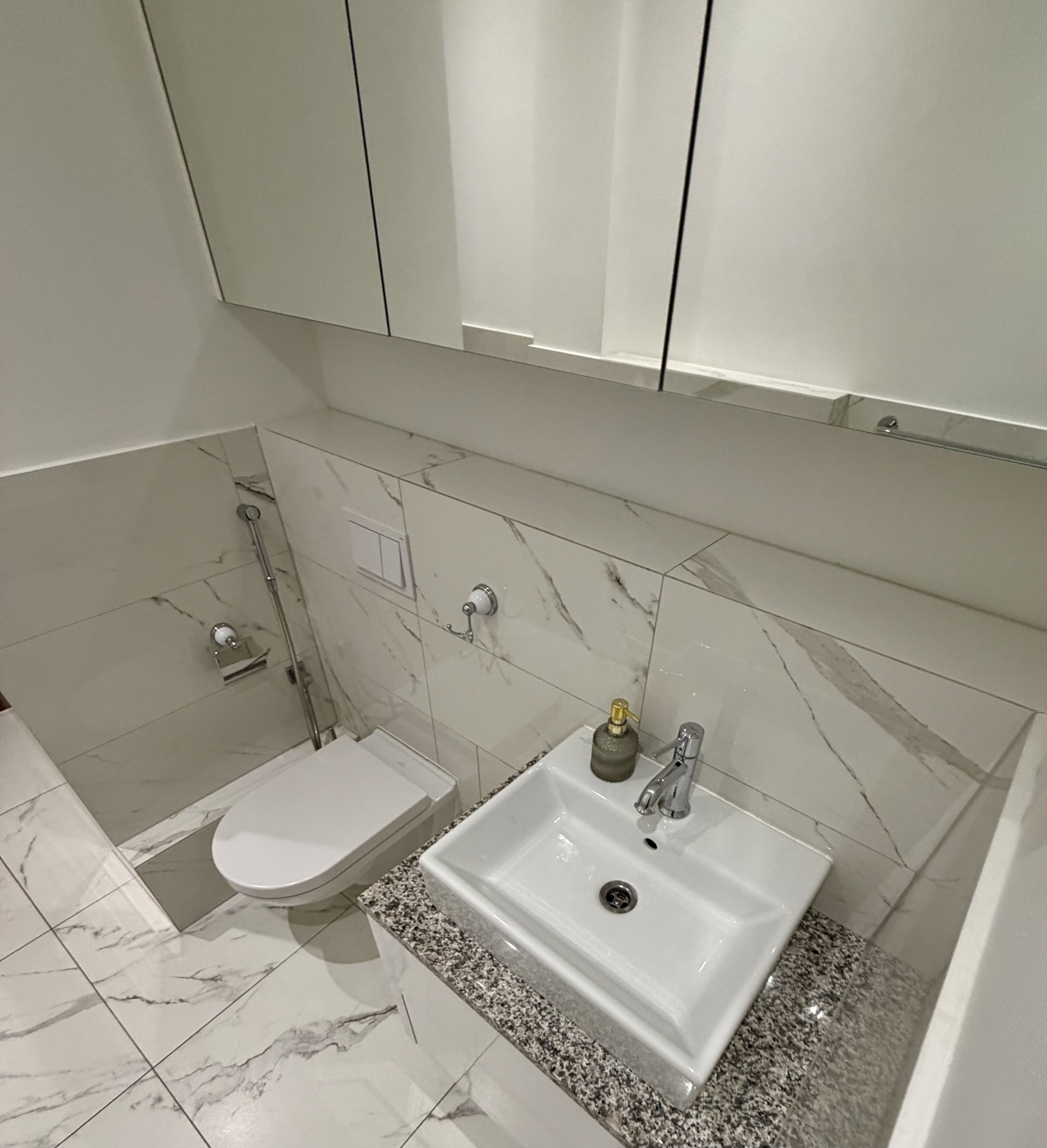 Koupelna je osazena sanitou Villeroy & Boch, prostorným sprchovým koutem, obklady v imitaci mramoru a je detailně doplněna zrcadly a stylovým koupelnovým vybavením. V samostatné komoře je k dispozici pračka se sušičkou LG.