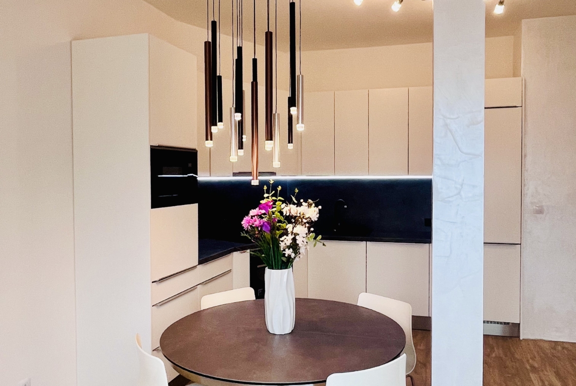 Obývací pokoj s kuchyňským koutem je vybaven kvalitní kuchyňskou linkou na míru s tlakovou impregnací, vestavěnými spotřebiči Elektrolux a přípravou na vestavěný kávovar. Obývací pokoj je bíle vymalován s elegantní kombinací perleťového benátského štuku, podtržen designovým osvětlením Novel a rozkládacím nerezovým stolem s keramickou deskou Livetastic.
