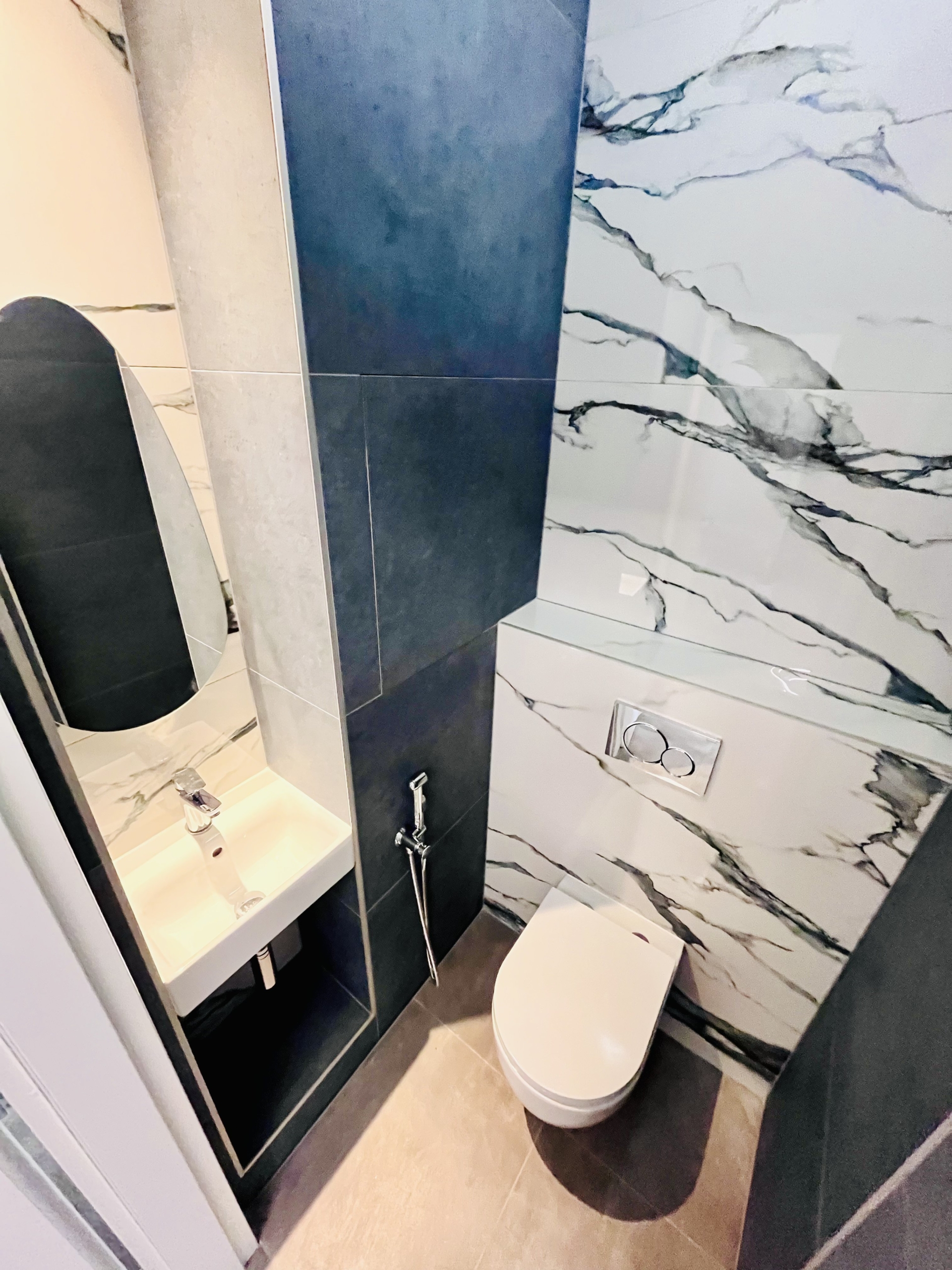 Samostatná toaleta disponuje umyvadlem a bidetovou sprchou.