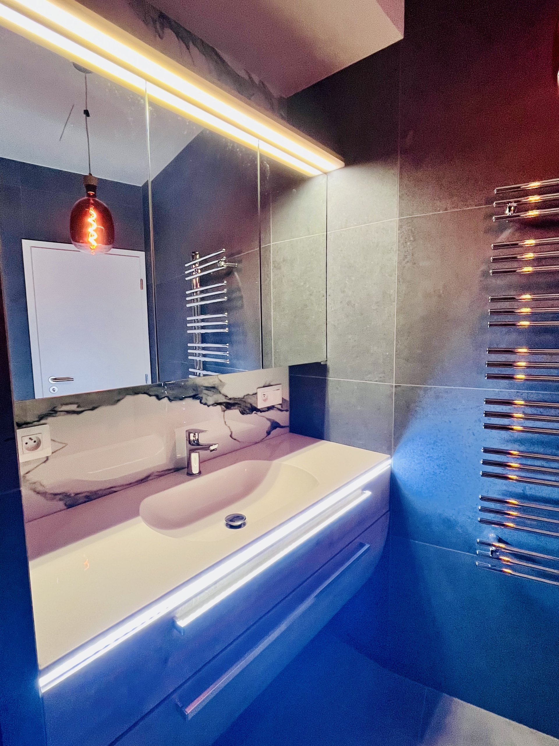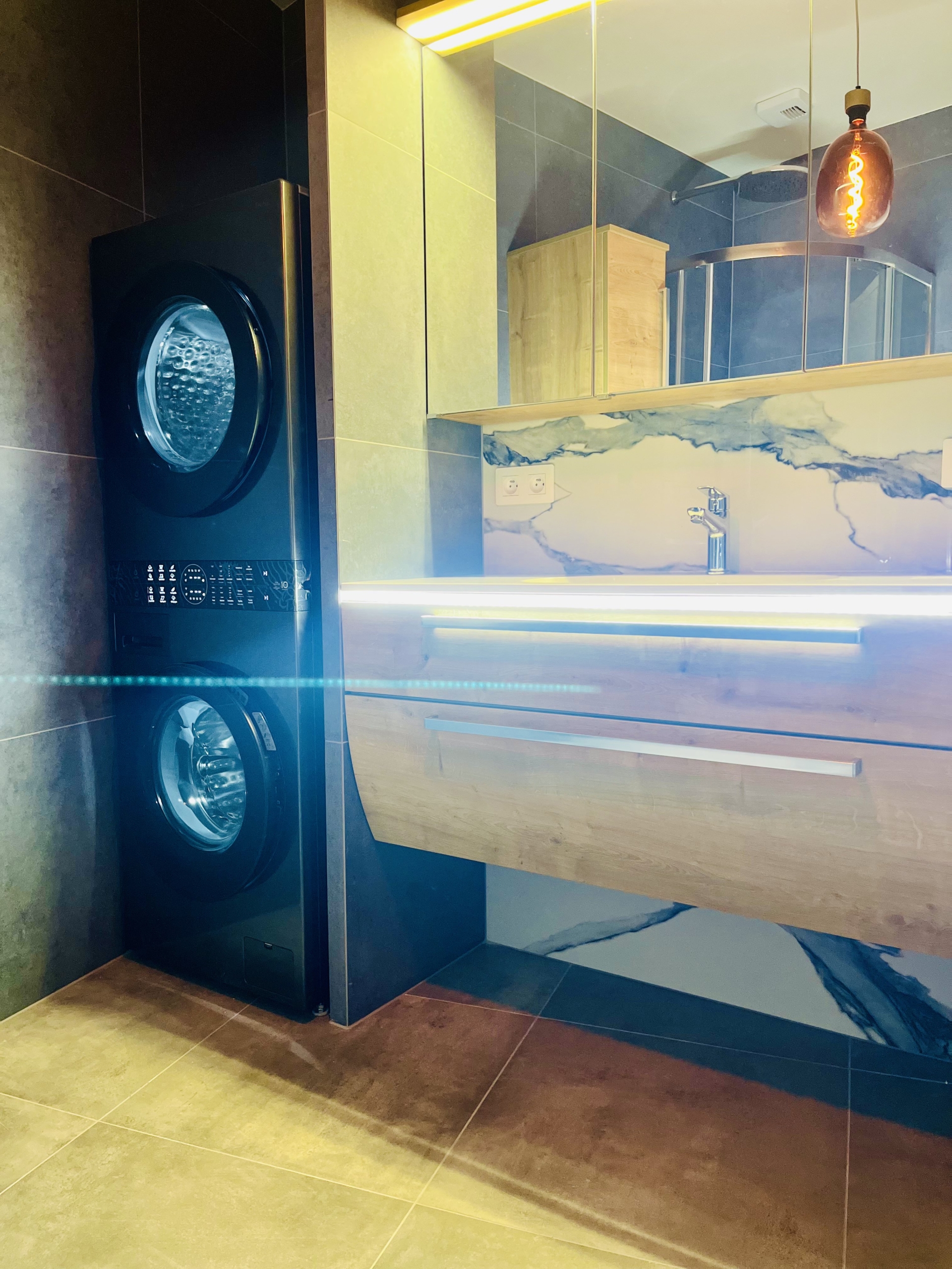 Koupelna je vybavena sprchovým koutem, pračkou a sušičkou LG v kompaktní věži, umyvadlem se skříňkou Dieter Knoll, zrcadlem, osvětlením Globo a topným žebříkem.